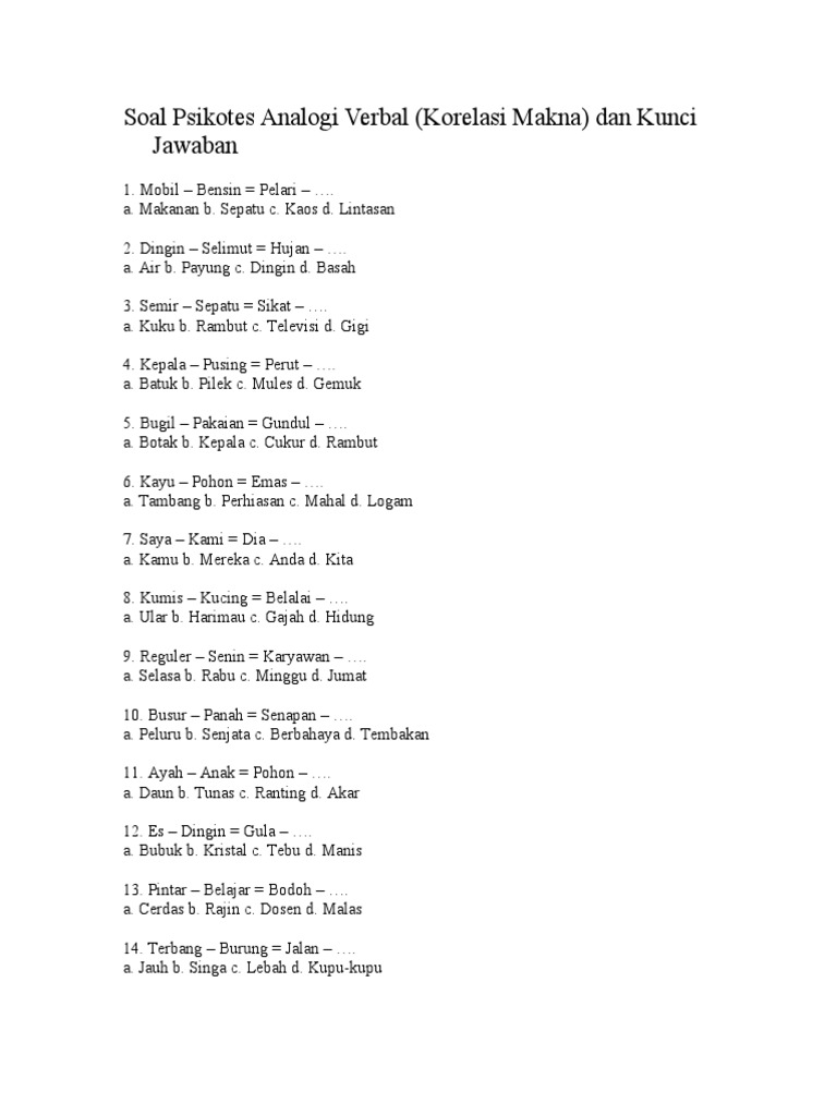 Contoh Soal Psikotes Analogi Verbal Dan Kunci Jawabannya